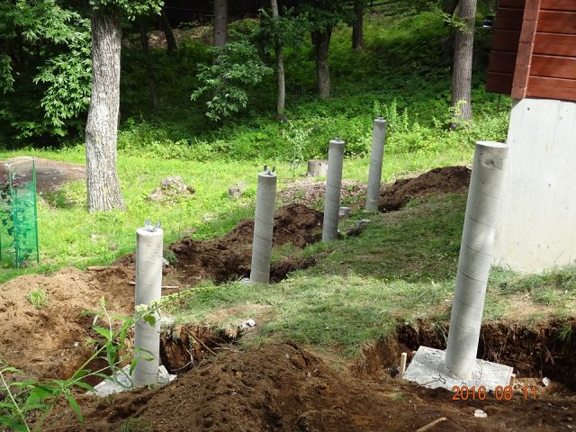 現場監督さんに確認すると、今日は機材の撤収を含め、午前中に作業を終える予定との事。あっと言う間に、7本の基礎は、枠が外され、ヒューム管も剥がされて、ほぼ完成形となった。