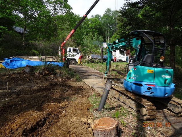 基礎工事5日目。間に1日お休みを挟んで、今日から「砕石敷き込み作業」が始まった。朝早くに大型クレーン車が敷地にやって来て「何事か?」と驚く。枕木スロープを守る「鉄板敷設」作業のためだった。