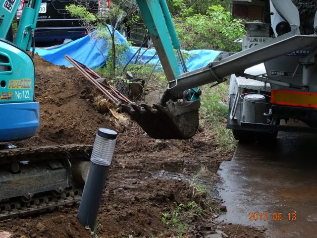 基礎工事7日目。「捨てコン打設」作業が行われた。「捨てコン」って言葉に騙されて、荒っぽい作業を予想していたのだが、実際は、ユンボで生コンを慎重に運んで目的の場所に流し込む。そして、コテで丁寧に均すという地道な作業だった。