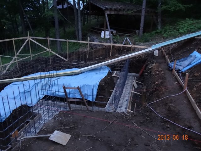 枕木駐車場から基礎まで、まるでプールの滑り台のように雨樋の化け物(シューター?)が繋げられた。翌19日は工事は1日お休み。20日は朝から生コンの流し込み工事となる。