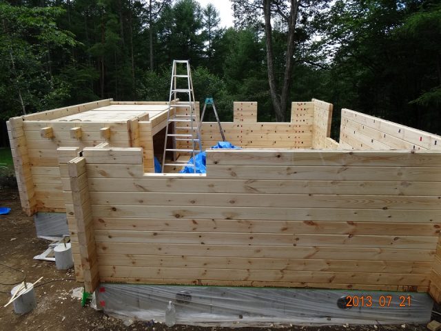 2013年7月21日土曜日。この日もTさんと次男を助っ人に、朝からログ壁の積み上げ(立ち上げ)作業と格闘。