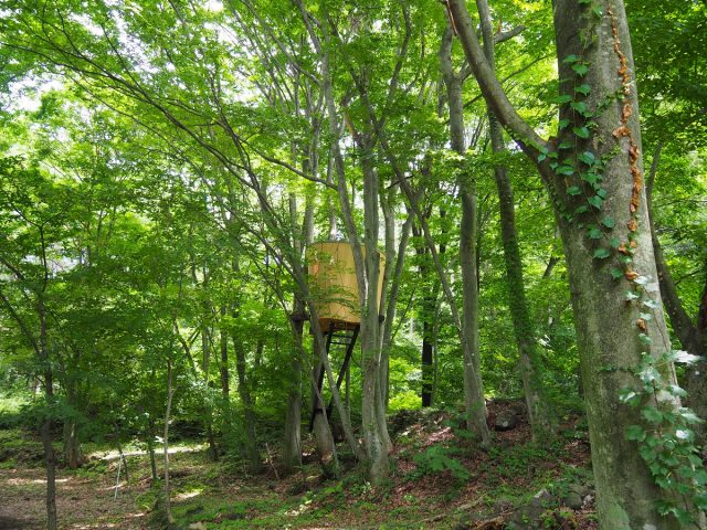 小諸ツリーハウスプロジェクト全般に言える事だが、ツリーハウスの設置場所はあまり高くない。メジャーを持参して計測したわけではないが、bird-apartmentを除けば、地面から2~3.5m程の高さにハウスの床部分があるように思う。空を見上げるような位置にある「空飛ぶ泥舟」や「高過庵」とはこの点が大きく異なる。