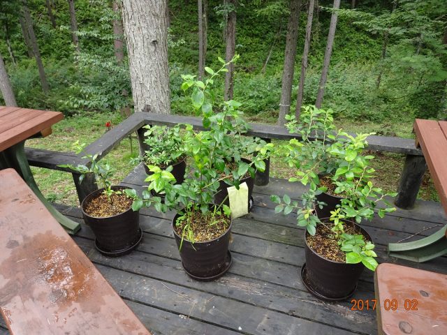 リハビリが必要なので、酸性のブルーベリーの土を鉢にたっぷりと注ぎ込んで、本宅メインウッドデッキの陽当たりの良い特別スペースを彼らに与えた。鹿は、ウッドデッキにまでは侵入してこないが、万が一に備えて周辺をガーデンデーブルやチェアでガード。
