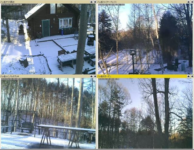 オフィスの状況が心配だったので、朝イチアポの前に、出先で確認。6台設置してあるWebカメラの内、室外の様子を映し出す4台を選びスクリーンショットを保存。本宅前の枕木テラスは雪で覆われているが、積雪は2cmといった感じだろうか。おそらく夜の内に雪が降ったのだろう。敷地内は朝日が射しているので、大雪の心配はなさそうだ。ちょっと安心した。