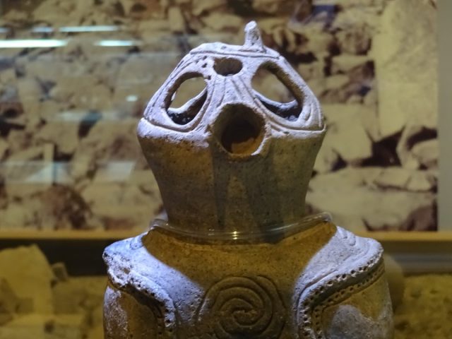 「異形」と表現される事が多い縄文土偶さんの中でも、ちゅうた君の造形のユニークさは際立っている。ガッシリとした両足の上に、直接お顔が乗ったように見える。目は穴で表現され、突起状のお口は上を向いており、私は初めて見たときに、まるで「ポット」のようだなと感じた。縄文人が果実酒でも作って、それを楽しむ際の器かな? なんて勝手に想像したのだ。