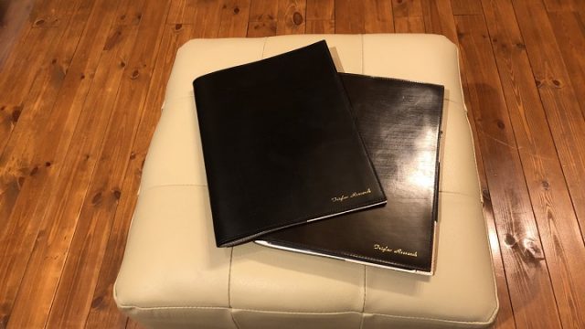 11月に、ブライドルレザー製のノートカバーを2冊購入(ブラックがビジネス用、チョコがプライベート用)。長いお付き合いの名入れ業者さんに社名の名入れをお願いし、準備万端。