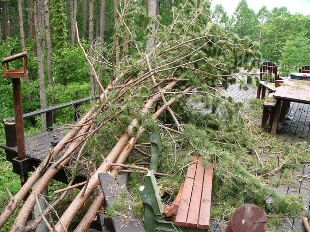 財産区林のアカマツの巨木が折れて、メインウッドデッキを直撃し、手摺りやベンチが無残に壊れていたのだ。正に「悪夢」… 財産区林のアカマツの中でも異形で目立っていた、太い幹の途中から2股に分かれていた大木が「犯人」だった。
