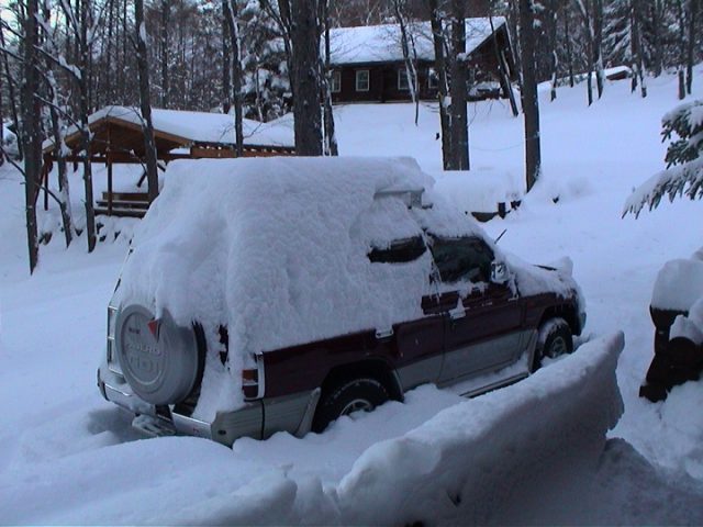 「どうも降雪量の違いがピンとくる写真は無いな…」なんて考えながら2001年の写真フォルダをクリックした。すると、いきなりとんでもない写真が現れて、飲んでいた珈琲を思わず吹き出しそうになった。「PAJEROが雪に埋もれている。と言うより、押し潰されているぞ!」