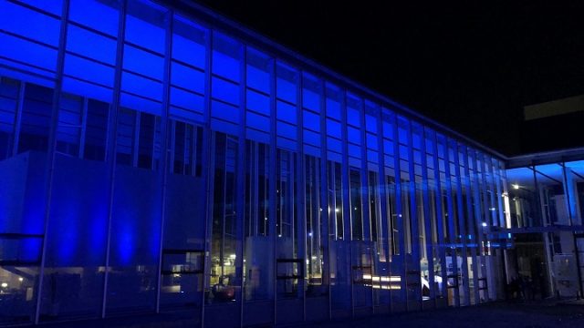 駐車場側の横断歩道まで歩くと、ブルーにライトアップされた市民館の全容が浮かび上がった。私が予想していたよりも、ちょっと光が弱めである。「ああ、この光量なら写真撮影した時の方が美しいな。もしかすると計算尽くかな?」なんて穿った見方をしてしまう。これも「小鉢男の悲しい性」である。
