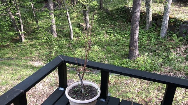 昨年の夏に元々勢いがなかった主幹が無残に折られてしまった。もう地植えは無理と判断し、冬の間に鉢に移植してオフィスのウッドデッキの上でリハビリとなったが「手遅れ」だったようだ。