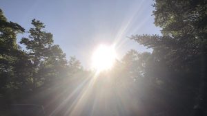 そんな事を考えながら、八ヶ岳オフィスのドアを開けて庭に出たら、ちょうど八ヶ岳(権現岳)の方角から朝陽が昇るところだった。時計を見ると時間は6時49分。樹上から射す力強い朝陽は、私にパワーを与えてくれる。