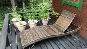 早速、メインウッドデッキの財産区林寄りの一画に置いて寝転がってみた。直線的でガッチリした作りだが、人工ラタン特有の適度な弾力感があり、1台目と同様、とても快適である。