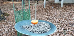 かつて使っていたBSパラボラアンテナを改造して作成した3号店は、今回のショートステイ初日にさらに改良を加え、ヒマワリの種を置くだけでなく、果実を串刺しに出来るアンカーを皿の中央に取り付けたのである。