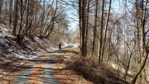 歩くのはかつての春~秋のお散歩道。我が家の敷地に隣接する財産区林の中を流れるフウキ沢(と言っても涸れ沢だが)に沿って林の中の登り道を進み、その後は、主に企業の保養所向けに分譲された別荘地区内の道をグルッと回って我が家に戻る約40分のコースである。