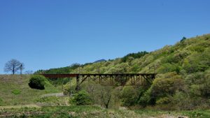 買い物の帰りに立沢川橋梁の脇の道を通った。冬の間は寒々しい朽ちたイメージしかなかった「旧立場川橋梁」の鉄錆の色が新緑に映えて、妙に美しく思えた。思わずD4を道路脇に駐車して写真撮影。
