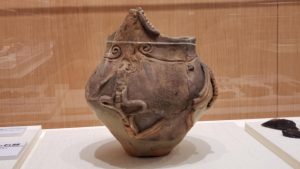 「あっ、これだ!」ごく普通に黒曜石の石器と一緒に並べられている土器が33番「殿村遺跡 人体紋付壺」だったのである。