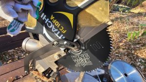 交換後には、電動丸のこ盤で焚き火用の木材カット。薪ストーブには広葉樹しか使わないが、焚き火にはウッドデッキの廃材やオフィスログキットの梱包材を小さくカットして使う(燃やす)。