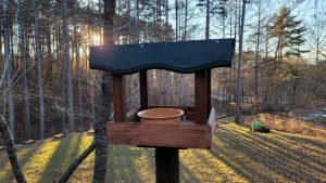 ひたすらビス打ちの組立作業を約20分。その後は支柱の台座に固定して、ヒマワリの種用の新しい皿(余っていた植木鉢皿)を取り付けて一旦作業は完了。所要時間は43分。