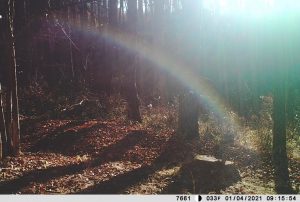 日時は今年1月4日の午前9時15分から16分。財産区林に「小さな虹」がかかった4枚の静止画と30秒の動画だった。