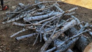 私が、庭をのんびりと敷地内を散策している間に、社主さまは薪になりそうな太さの枝を白樺の幹の上に大量に運んでいた。