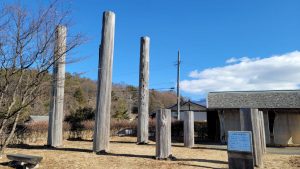 これは、発掘調査で見つかった柱穴列に柱を再現したものなのだそうだが、私は「高低2組(セット)の御柱」のように思えるのだ。