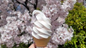 南口ゲートのすぐ近くには売店があり、そこで「桜ソフトクリーム」を買って、タカトオコヒガンザクラの花を眺めながら味わう。