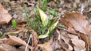なんて思いながら、オフィスエントランスの地面に目を凝らすと、あっ、ホワイトフェザーの芽が出ているぞ。