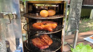 結局、残った部材(ベーコン・ソーセージ・半熟卵)も社主さまの感覚任せでスモーク作業は終了。