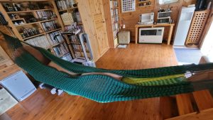 この時期の八ヶ岳オフィスにおける「昼下がりの最大の楽しみ」は「ハンモックに揺られての読書」である。