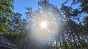 メインウッドデッキに出てみると、財産区林の樹間から力強い陽の光が射していた。