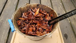 手に取って臭いを嗅ぐと、今年配備したモノは木酢液特有の「焦げ臭くてちょっと酸っぱい」臭いを明らかに発しているが、昨年モノは、ほぼ無臭である。
