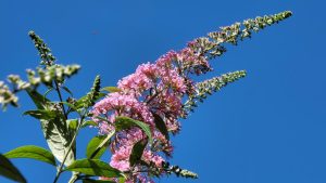 そのまま庭に出た。八ヶ岳から移植した「ピンク(ライトパープル)」のブッドレアが咲き始めていた。