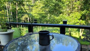 早速、朝の珈琲(今日は富士見高原ブレンド)を淹れて、オフィスのウッドデッキで味わった。