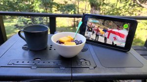 珈琲カップとヨーグルトを置いて、さらに Galaxy Tab Active3を置くとジャストサイズ。
