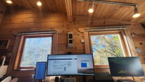 オフィスの2台のデスクトップPCの背景には2つの窓がある。