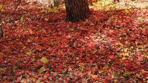 滝のすぐ脇の楓の下には、艶やかな紅の絨毯が敷き詰められていた。