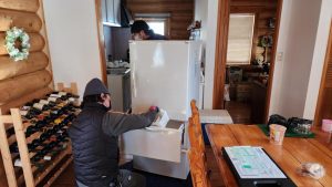 午後1時過ぎに配送業者さんがやってきて、まずは古い方の冷蔵庫さんの搬出作業を開始。