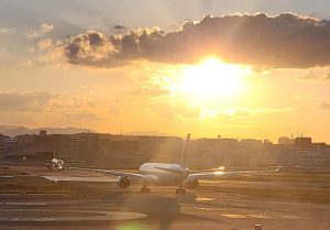 講演を終えた後、福岡空港のラウンジで見た夕陽は美しかったな…