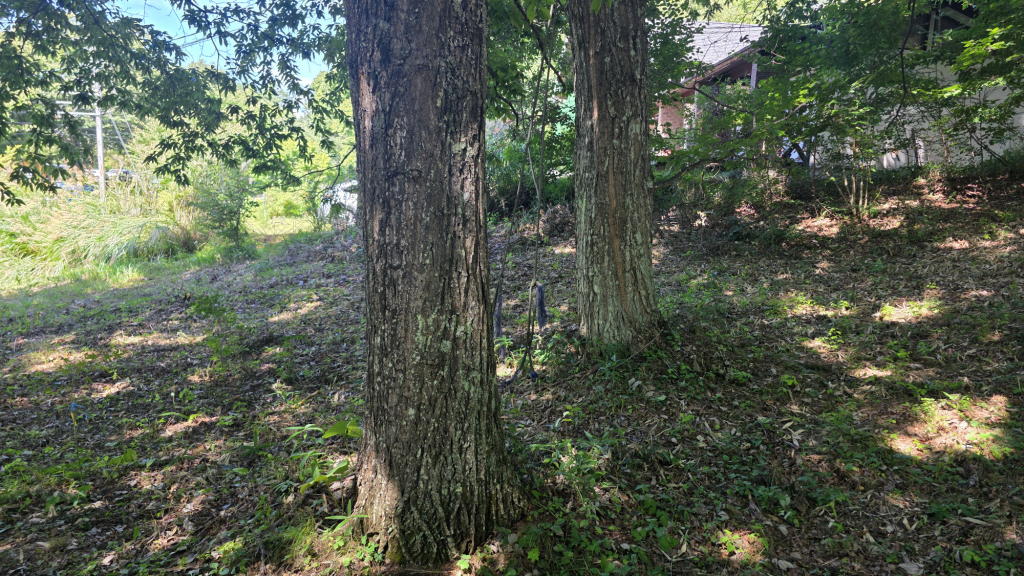テニスコートと鉢巻道路の間のフラットスペースでは、もう「神さまの木」と呼べそうな広葉樹が何本も存在感を誇示しており、その一帯は「雑木林風の庭作り」に最適である。