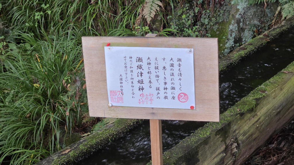 これまであまり気にしなかったのだが、湧き水が流れる木製の水路の脇には「瀬織津姫」さま縁の神社である事を示す立て札があった。