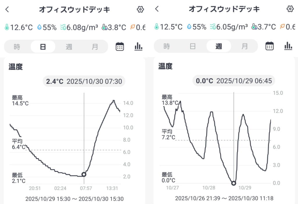 オフィスウッドデッキに設置した温湿度モニターを確認したら最低気温は2.1°。