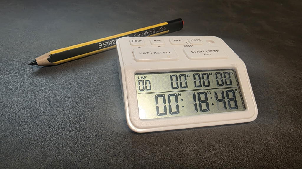データインプット作業では、1社ごとにキングジムの学習タイマー「ルラップ」で、要した時間を秒単位で計測して、しっかりと記録を残す。