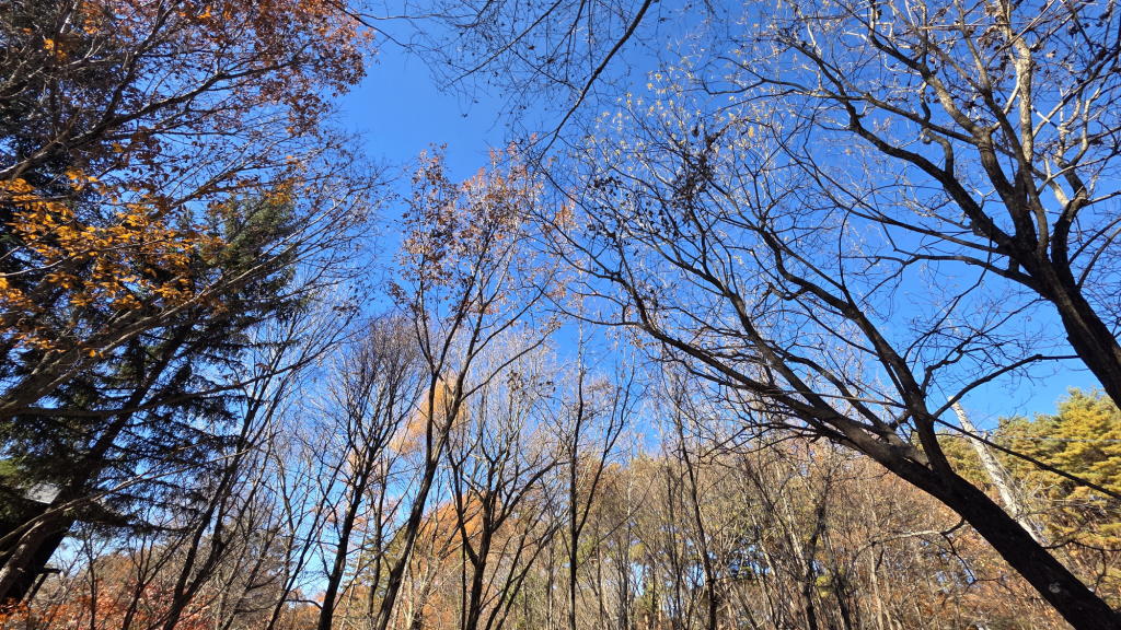 これでも十分に美しいだが、唐松の落葉の最も美しい瞬間は、落葉の最盛期、風に吹かれて舞い落ちる葉が陽光に照らされて輝く「黄金のシャワー」の時なのだ。