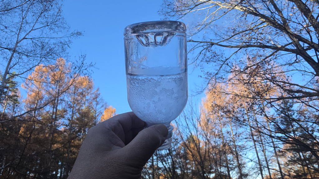オフィスエントランスに置いたペットボトルの水は完全に凍りついて、逆さにしても、水がこぼれる事はなかった。