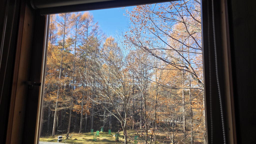 オフィスの窓の外には、これから落葉が本格化するであろう唐松と広葉樹の林の光景が広がる。