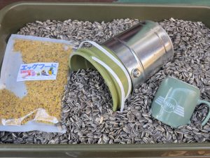 エーイ、ついでだからヒマワリの種をストッカーに入れて、給餌台の準備も済ませてしまおう。