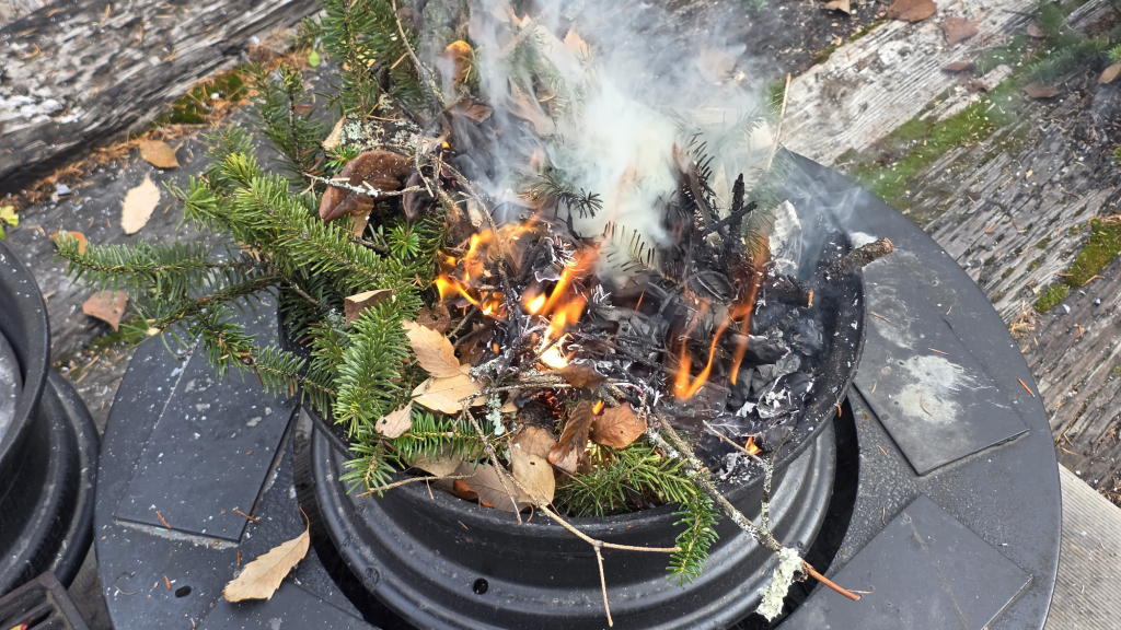 ウラジロモミの枝の残材は日の入り後も、焚き火台の中で静かに燃え続けた。