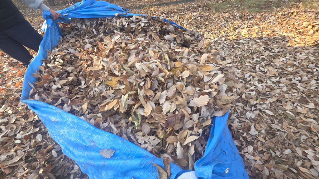 落ち葉は、ブルーシートに吹き集めて、腐葉土作りのために用意したスペース(穴)へと運ぶ。