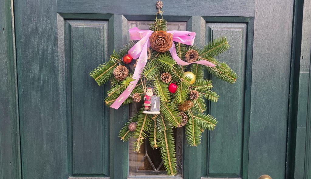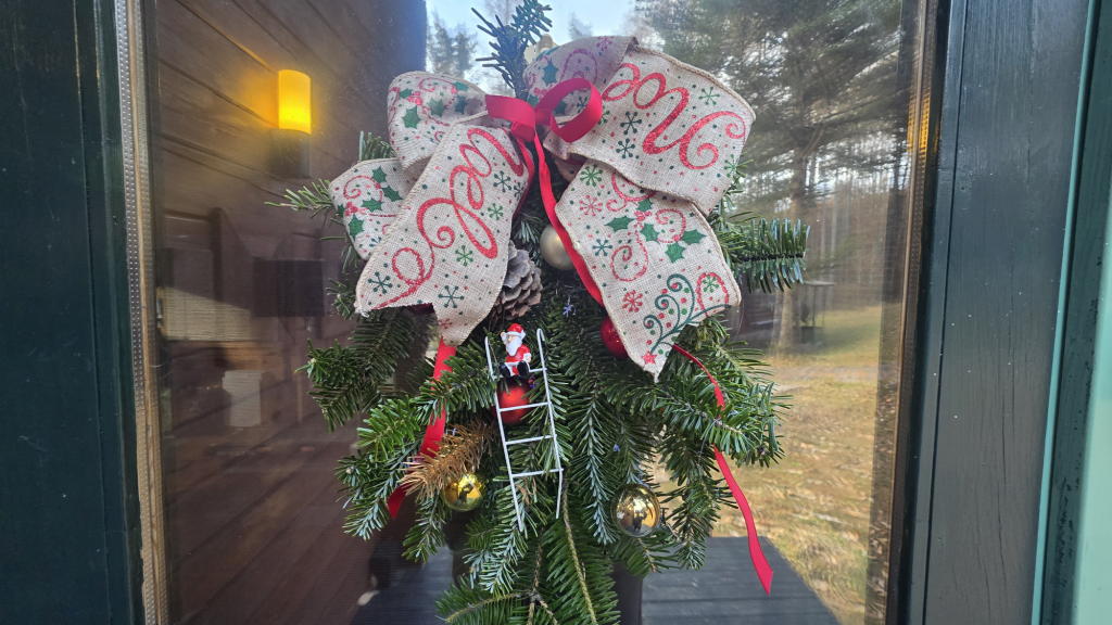 本宅とオフィスのドアには、伐採したウラジロモミさんの枝や敷地内で拾い集めた松ぼっくりを使って、社主さまがササッと作り上げたスワッグが掛かっている。