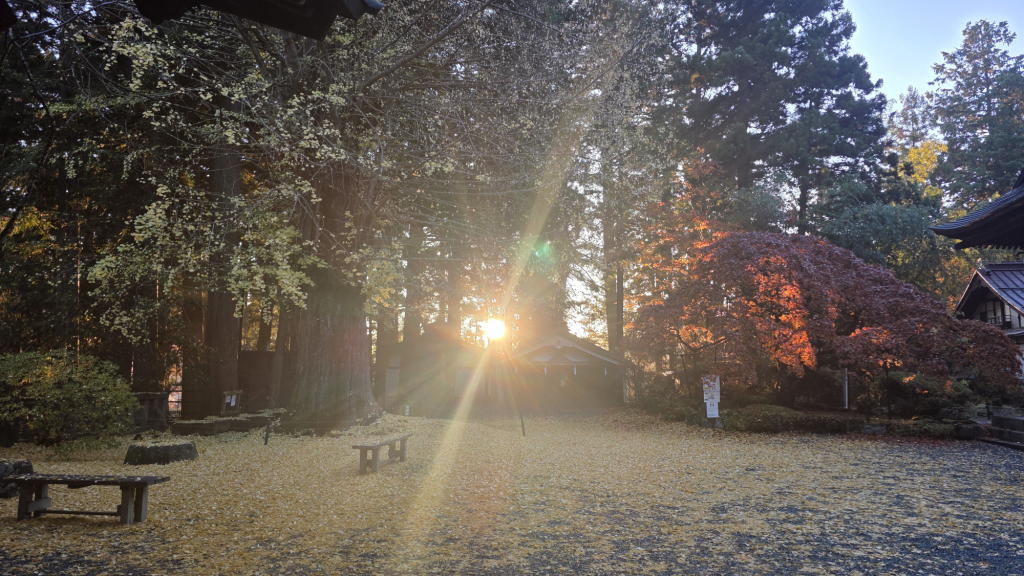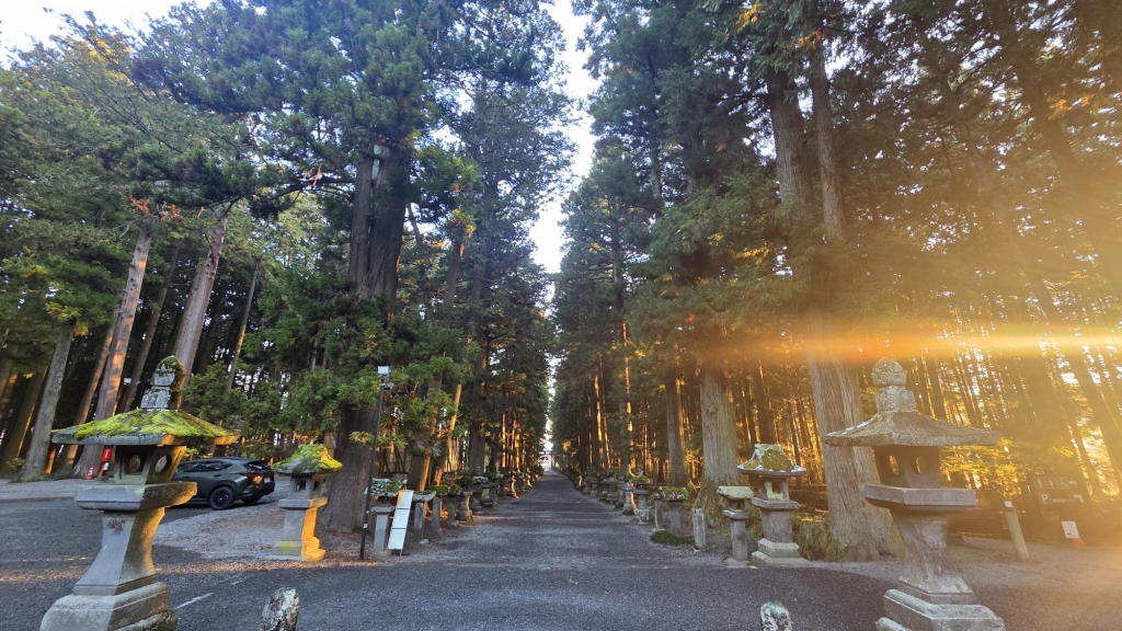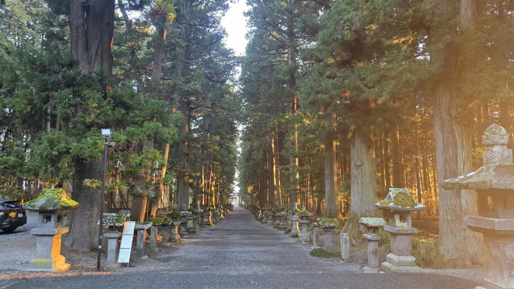 長い参道が一望出来る場所に差し掛かった瞬間、真横から、始めは柔らかくほんのりと、その後、力強い一文字の朝陽がサッと射してきた。